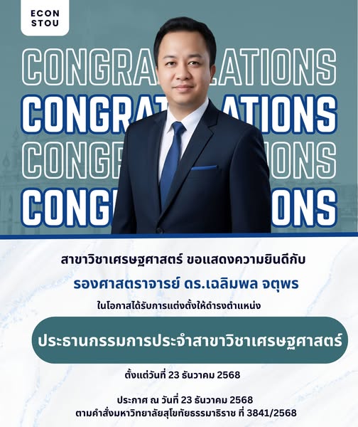 - คณาจารย์ เจ้าหน้าที่สาขาวิชาเศรษฐศาสตร์ แสดงความยินดีกับ รองศาสตราจารย์ ดร.ทวีวัฒน์ วัฒนกุลเจริญ กรรมการสภามหาวิทยาลัย รักษาการแทนอธิการบดี ผศ.ดร.พัชรี ผาสุข ดำรงตำแหน่งรักษาการแทนรองอธิการบดีฝ่ายวิชาการ มหาวิทยาลัยสุโขทัยธรรมาธิราช วันที่ 7 ตุลาคม 2568 ณ อาคารบริหาร ชั้น 5 และแสดงความยินดีกับผู้บริหารที่ได้รับการแต่งตั้งของมหาวิทยาลัยสุโขทัยธรรมาธิราช