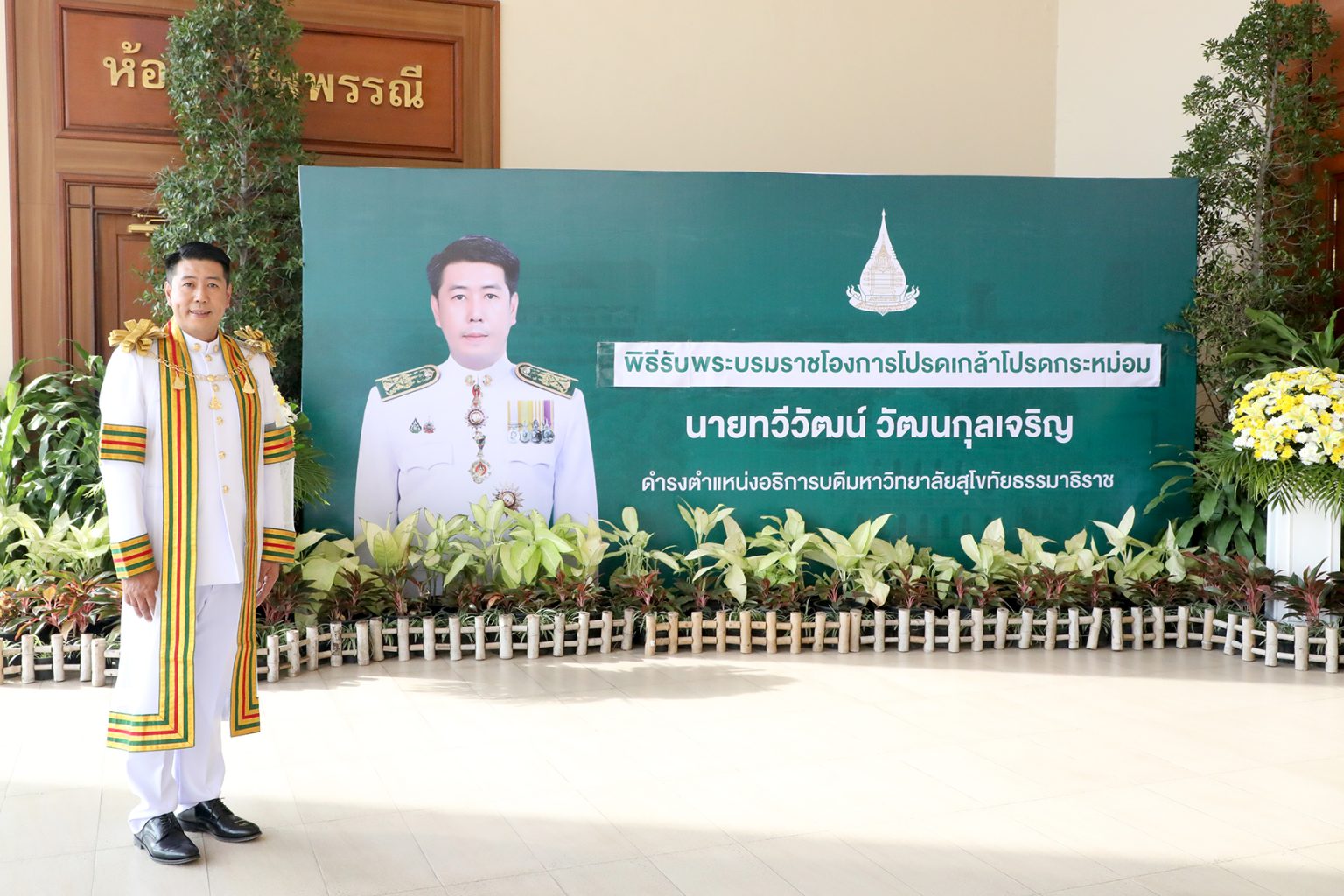 รศ.ดร.พัชรี ผาสุข รองอธิการบดีฝ่ายวิชาการ รักษาการแทนประธานกรรมการประจำสาขาวิชาเศรษฐศาสตร์ และเจ้าหน้าที่ร่วมพิธีรับพระบรมราชโองการโปรดเกล้าฯ แต่งตั้ง รองศาสตราจารย์ ดร.ทวีวัฒน์ วัฒนกุลเจริญ ดำรงตำแหน่งอธิการบดี มสธ. วันที่ 9 ธันวาคม 2568 ณ ห้องพระปกเกล้า อาคารอเนกนิทัศน์ โดยมี ศาสตราจารย์พิเศษ ธงทอง จันทรางศุ นายกสภามหาวิทยาลัยสุโขทัยธรรมาธิราช เป็นประธานในพิธี